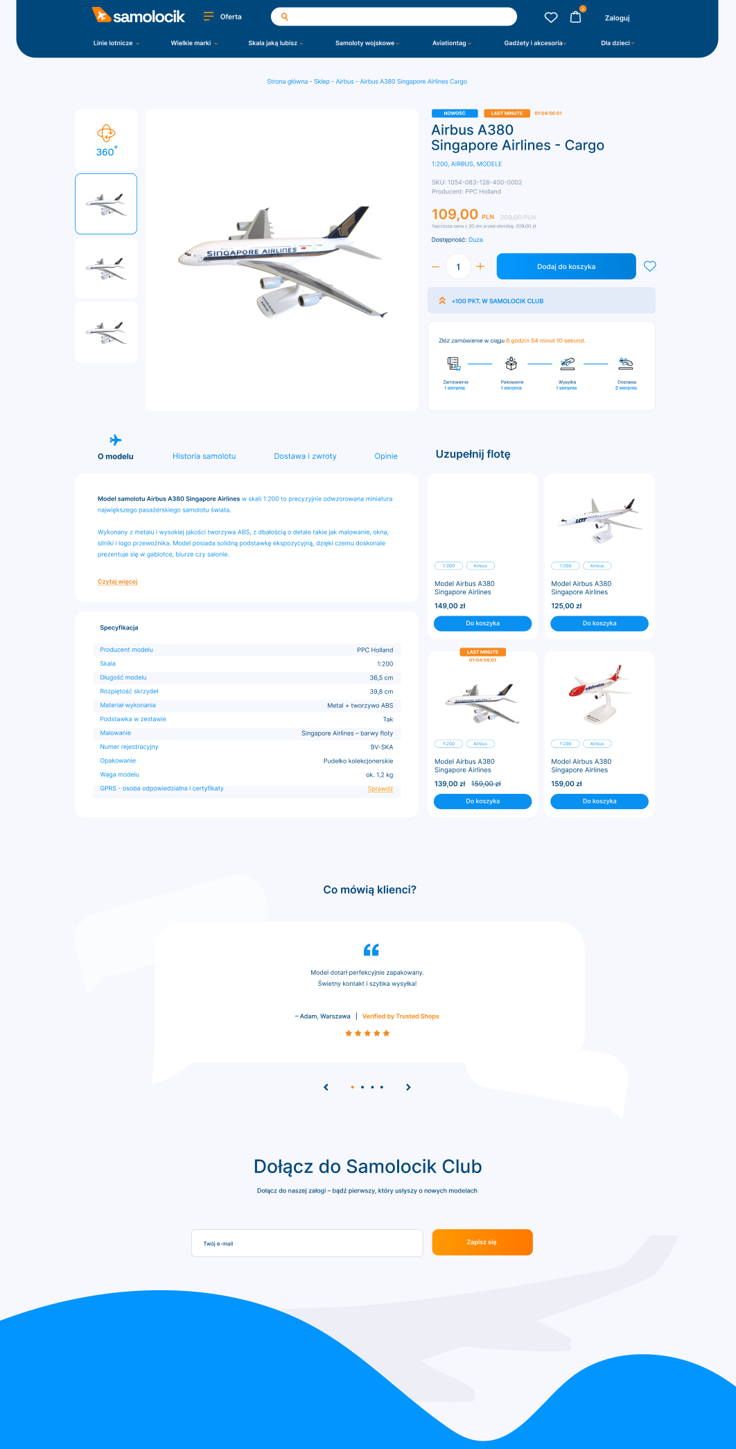 Samolocik to e-commerce skierowany do pasjonatów lotnictwa i kolekcjonerów modeli samolotów, z bardzo szeroką i wielowarstwową ofertą produktów. W ramach projektu odpowiadaliśmy za stworzenie nowego sklepu internetowego, odświeżenie komunikacji i warstwy wizualnej marki oraz zaprojektowanie całego doświadczenia zakupowego od nowa. Istotnym elementem było odejście od starego, ograniczającego rozwoju sklepu na rzecz nowego rozwiązania, które porządkuje katalog, poprawia wydajność i lepiej komunikuje ofertę. Po naszej stronie było także przygotowanie UX i wdrożenia z myślą o rozbudowanej nawigacji, filtrowaniu, wyszukiwarce, koszyku, integracji z systemami klienta oraz migracji SEO. W samym serwisie widoczna jest bardzo szeroka struktura katalogu i wiele ścieżek wejścia w ofertę, co potwierdza wagę architektury informacji w tym wdrożeniu.